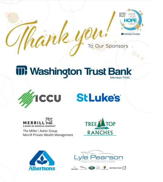 Four seats at Idaho Youth Ranch VIP table Table signage listing company name Company logo featured on e-blasts, social media, event stage, and event website with link to company website Guided tour of Hands of Promise Campus and use of Sage Equine Center and grounds for a corporate retreat or meeting